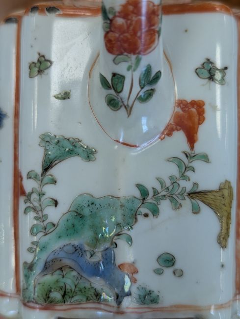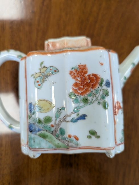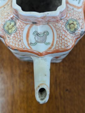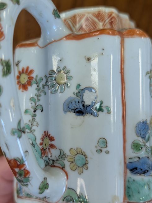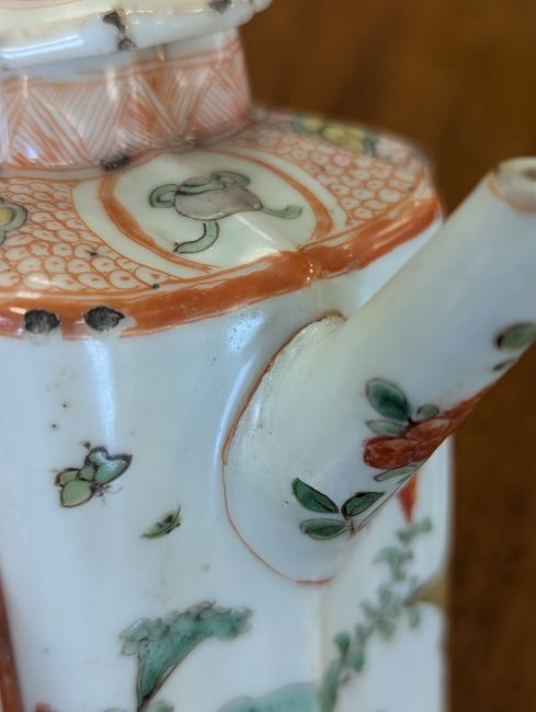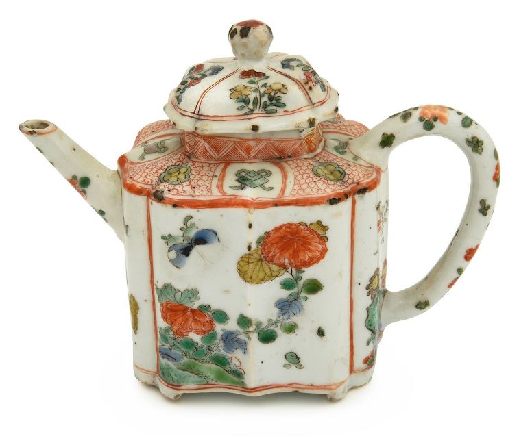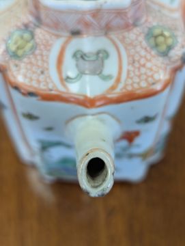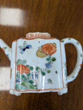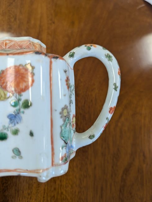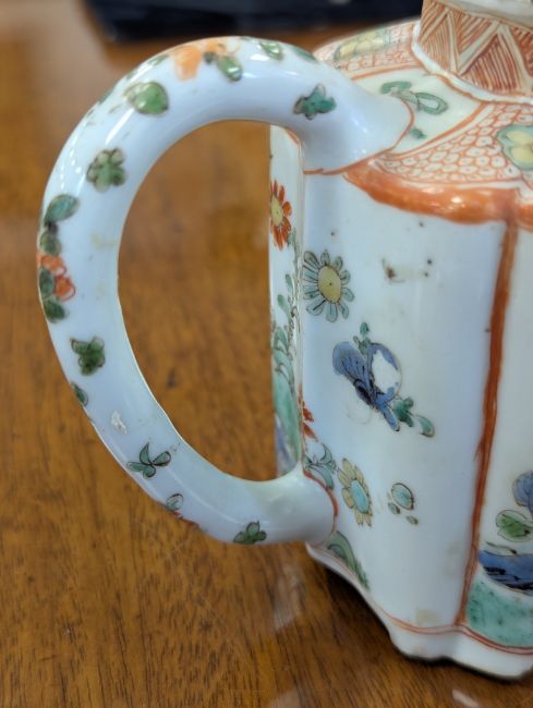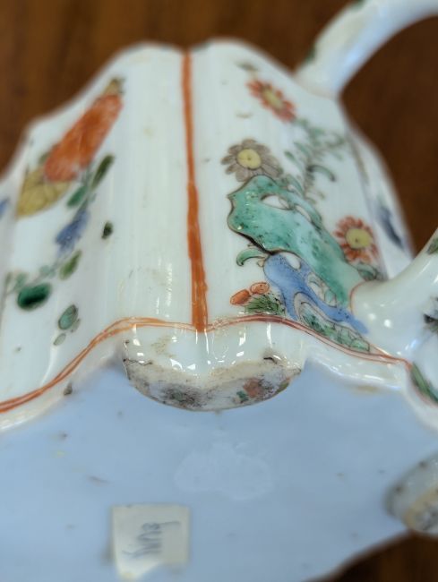 Condition: Heavy restoration throughout. Chips to the feet, spout and shoulder. Rocks on a flat surface. Crack to the handle.