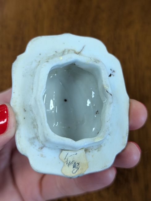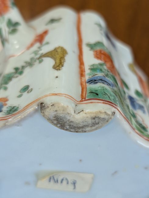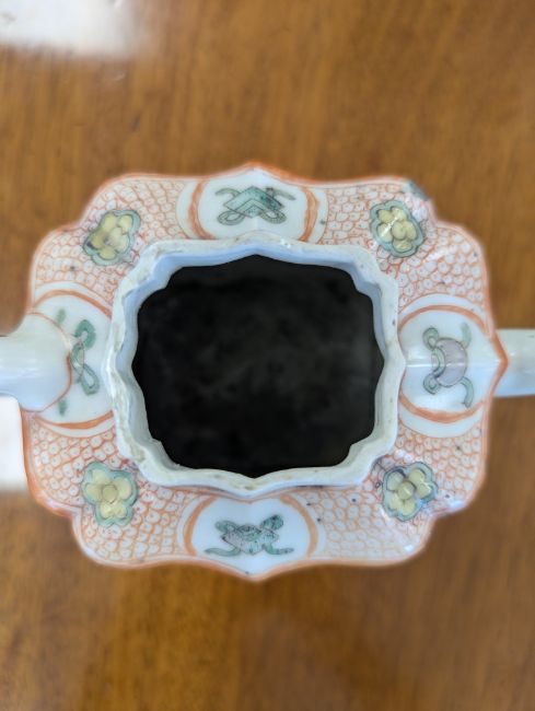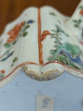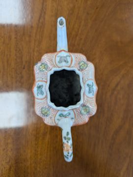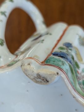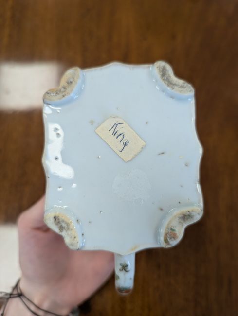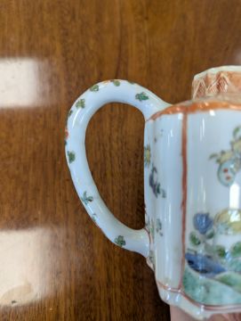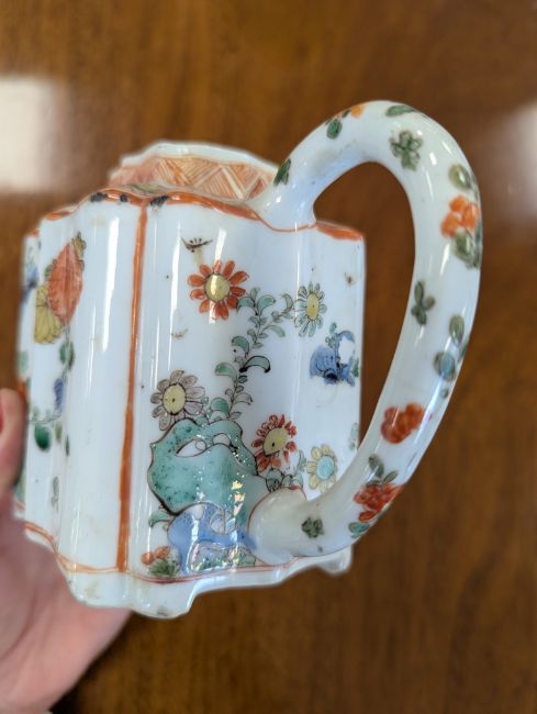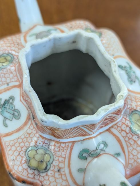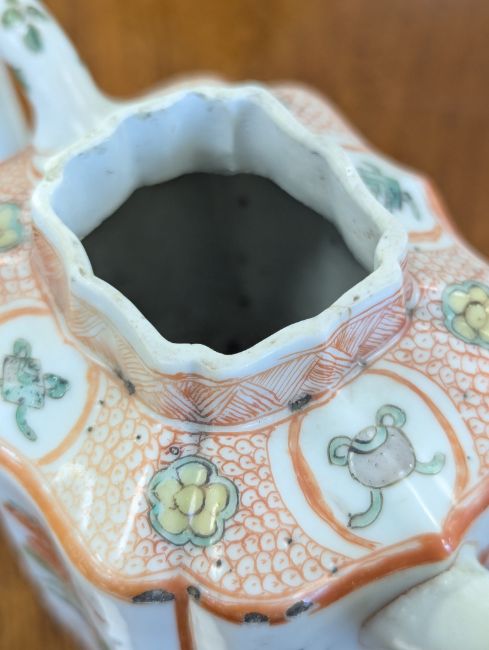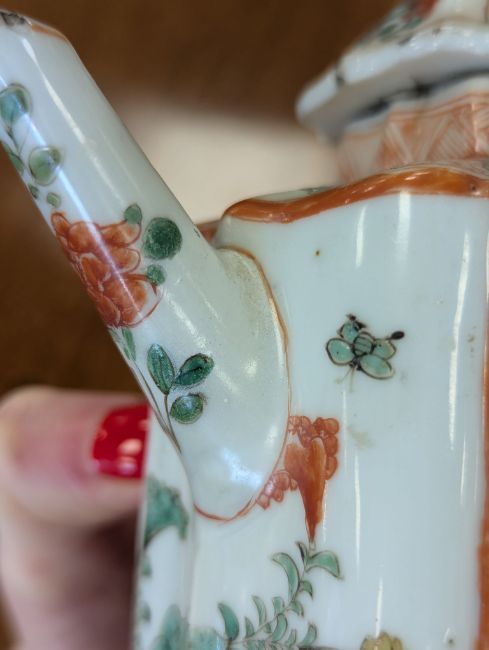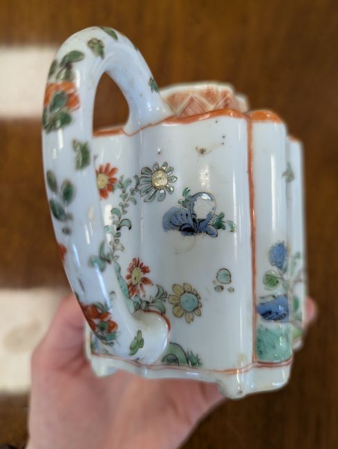 Condition: Heavy restoration throughout. Chips to the feet, spout and shoulder. Rocks on a flat surface. Crack to the handle.