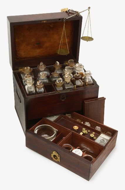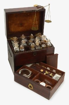 the lid opening to reveal a divided interior containing fifteen square glass bottles of varying sizes with securing rod lifting out to reveal a drawer below containing further glass bottles and tin containers, with sliding compartments with glass pestle and mortar and further glass jars, with brass recessed carrying handles to the sizes