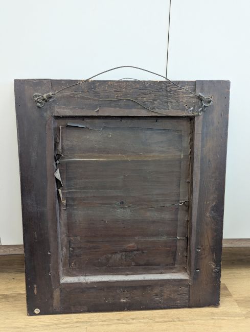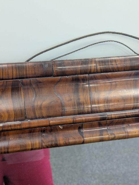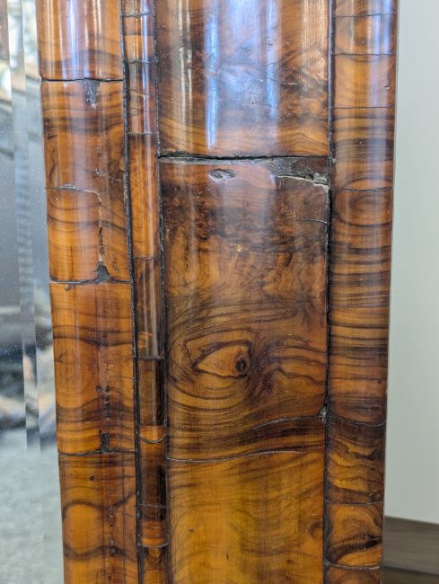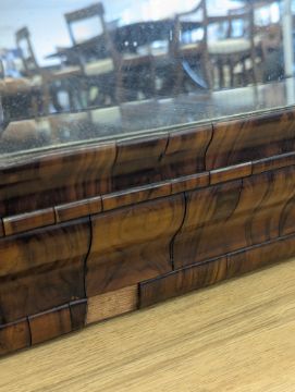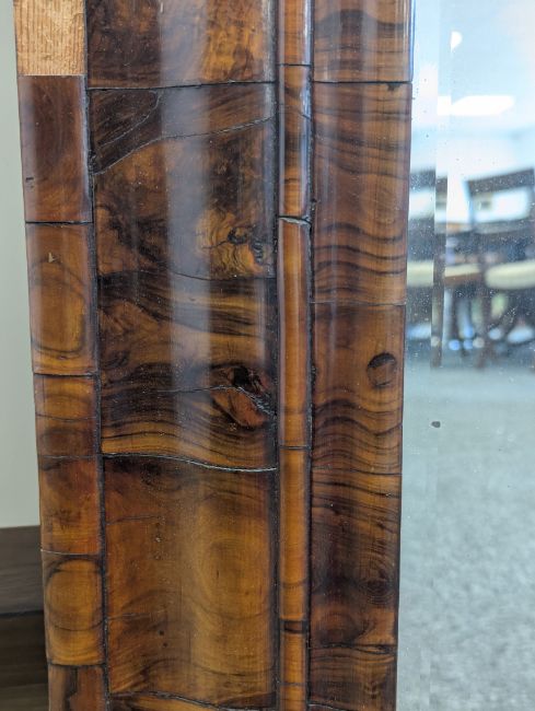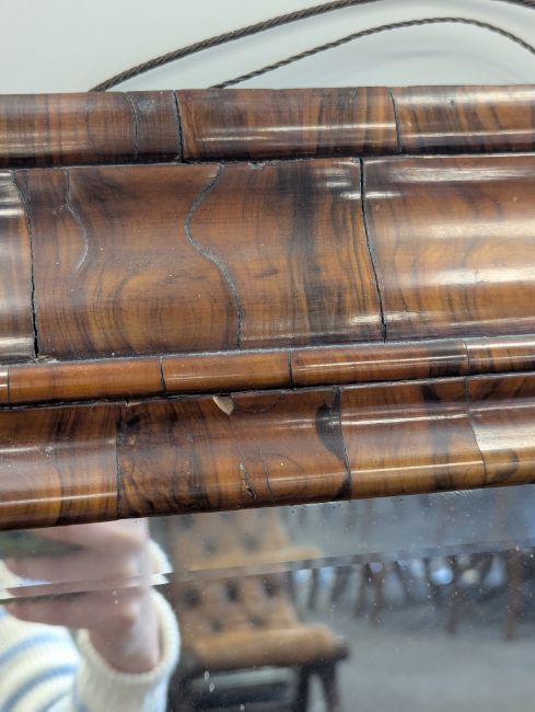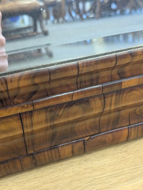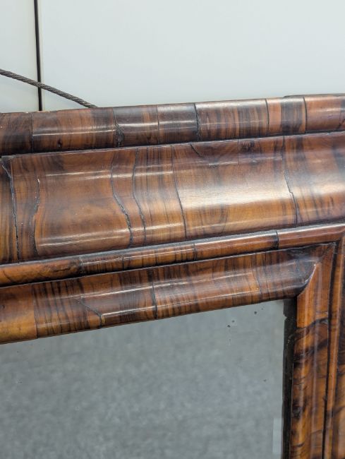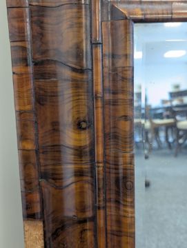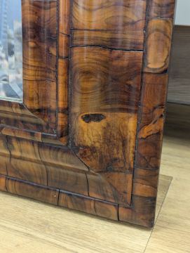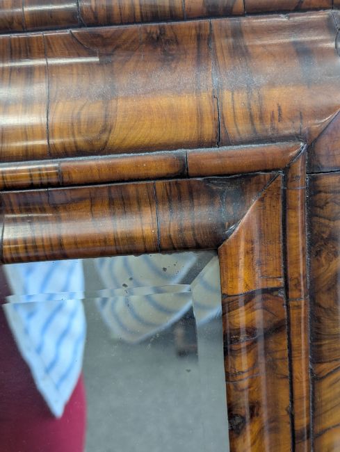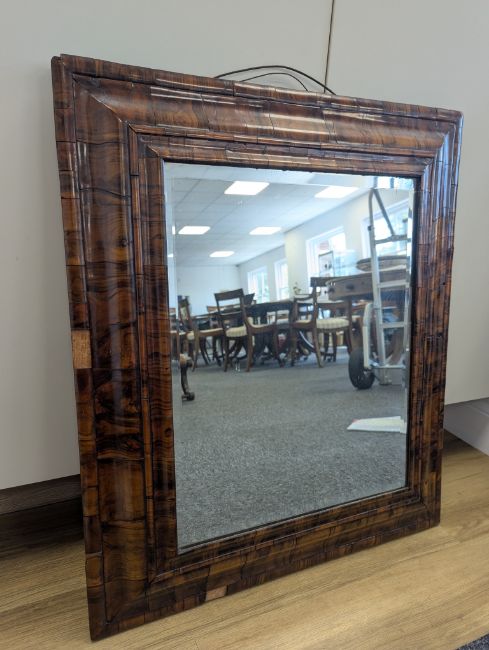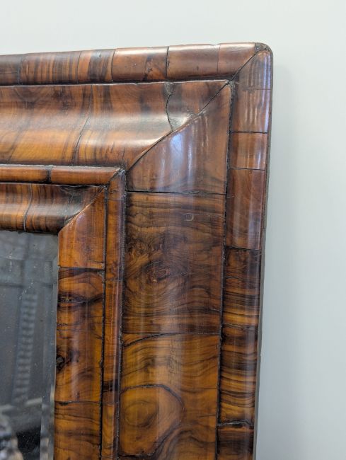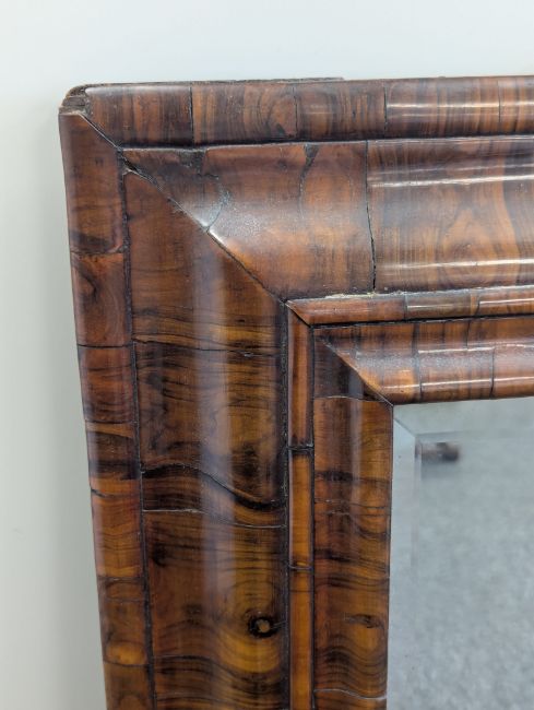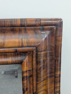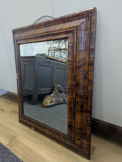 of rectangular form, the olive wood oyster veneered frame enclosing a bevelled mirror79 x 65cmCondition: Sections of veneer has been re-glued on. Minor foxing to the edge of the mirror plate. Losses to the edges. Please note this is olive wood not walnut