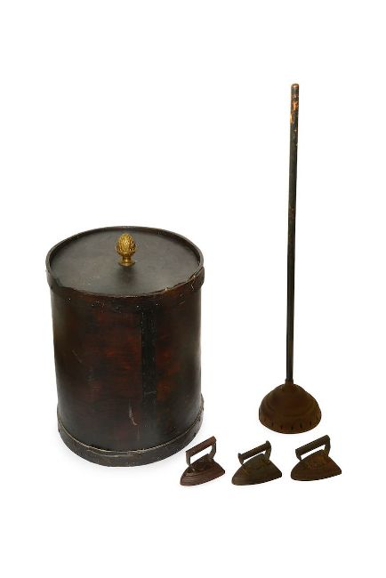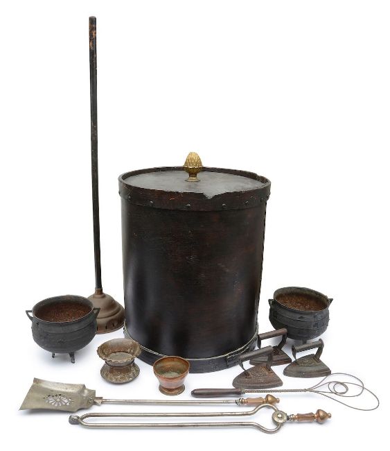 20th century, in the form of a barrel, together with three smoothing irons, a plunger, a pair of iron, cauldrons, a collection of fire tools, and two copper pots (qty.)