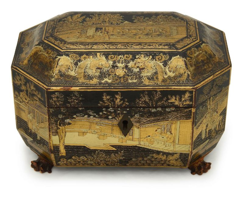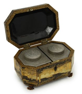 Qing dynasty, mid 19th century, of octagonal form, the sides decorated with palace scenes of figures eating food, the reverse with shipping boats on a river, the hinged lid opening to reveal two base metal compartments, engraved with birds within a floral border, with ivory handles, the whole raised on claw feet