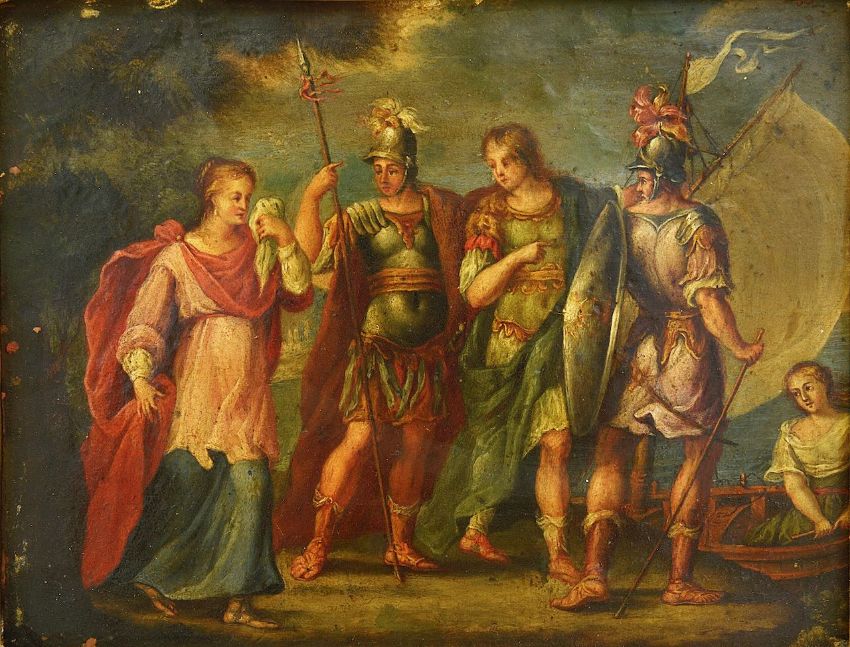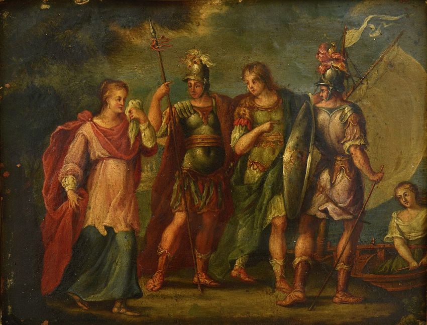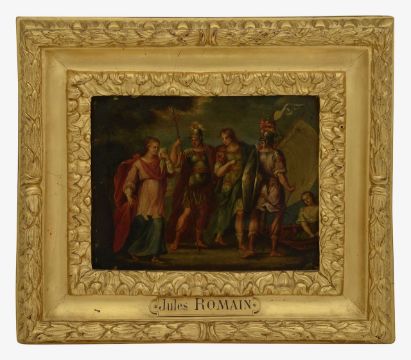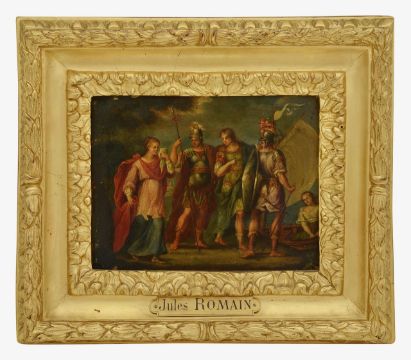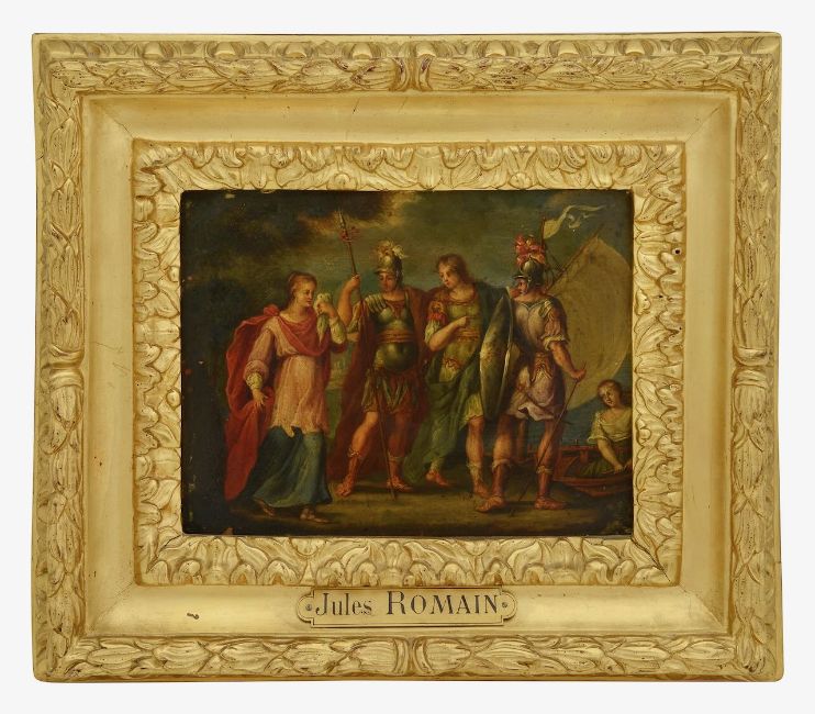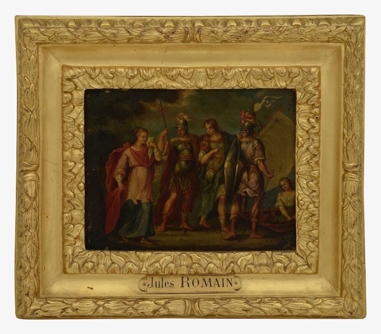 Circle of Giulio Romano/Jules Romain (Italian, c.1499-1546)'Departure of Andromache after the Siege of Troy'indistinctly inscribed, bearing date 1618(?) and name 'Jules Romain' verso in ink, titled in French to later back, name plaque to frame, oil on copper15.8cm by 21.7cmCondition: Provenance: A Private CollectionAcquired early/mid 20th century by vendor's grandmother from art dealer Monsieur D. Piraud in Grenoble