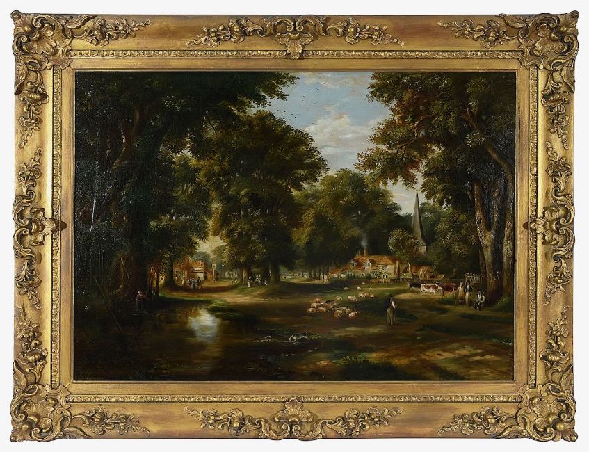 Pastoral 'View of Chislehurst' village, with shepherd and flock, surrounded by trees, Tiger's Head inn, St Nicholas' church and various cottages