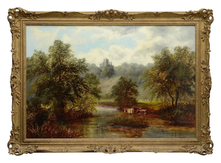River landscape with castle atop hill possibly Richmond.