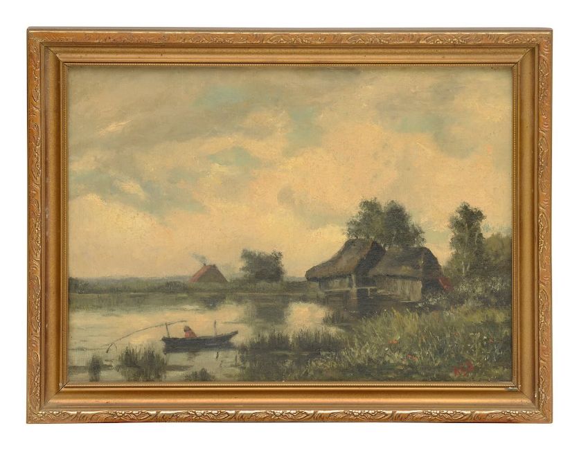 English landscape with fisherman in a rowing boat on lake