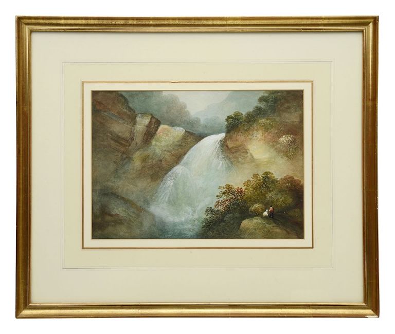 'Figures by a Lakeland waterfall'