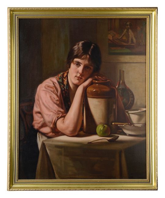 William Merrett Hodges (British, 1891-1961)Portrait of the artist's faughter Constance, seated with arms resting on pottery jarlabelled verso, oil on canvas75cm by 60cmCondition: Provenance: A Private CollectionBy family descent