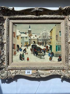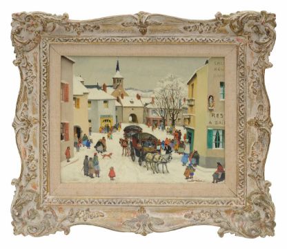 A French townscape in winter, with coaches, horses and figures outside a restaurant