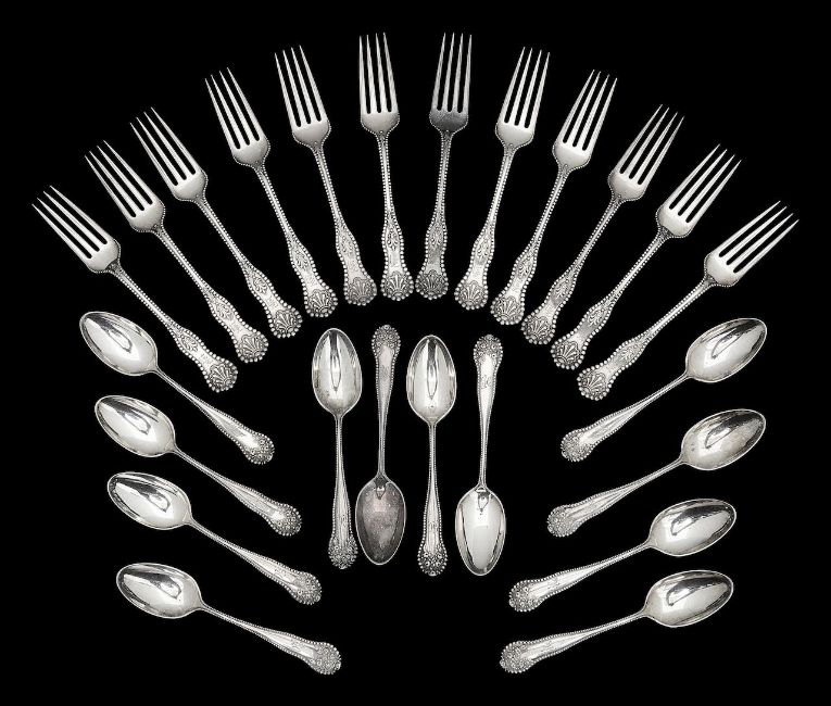 comprising twelve American forks, by Julius C. Walk, marked Sterling,with a beaded border and engraved initials, and twelve similar spoons, the terminals decorated with roses (24)