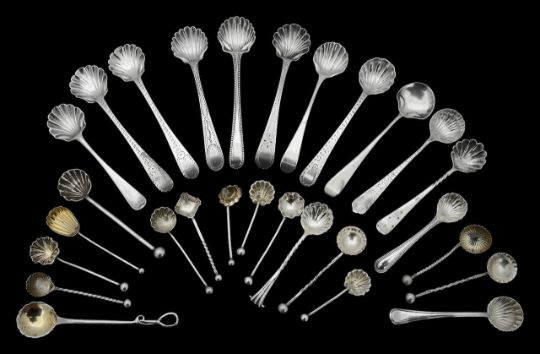 George III and later, of varying sizes and forms, including examples by Elkington, William Stroud and Horace Woodward, bright-cut engraved examples and Onslow pattern spoons (qty.)