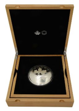 the obverse of the convex-shaped silver coin features the effigy of Her Majesty Queen Elizabeth II by Susanna Blunt. reverse; design by Royal Canadian mint engraver Stan Witten featuring a bouquet of five sugar maple (Acer saccharum) leaves. Limited mintage world wide. In box and capsule with certification; Royal Canadian Mint.