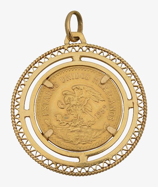 A Mexican gold 20 Pesos 1959 coin, in a yellow metal pendant mount