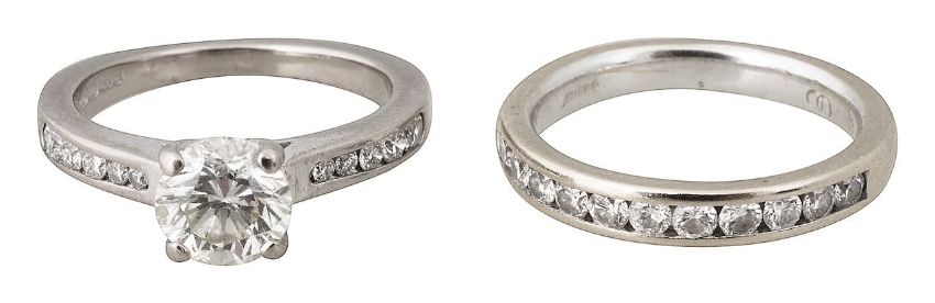 with 18ct hallmark, brilliant cut diamond in a cathedral setting with raised diamond set shoulder and a eternity band with 18 ct hallmark, eleven round brilliant cut diamonds channel set to a plain band (2)