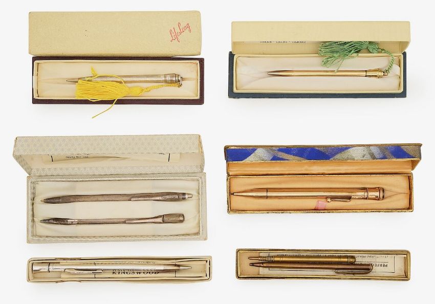 comprising a Life-Long 'Chusan' pencil marked Sterling, a silver Eversharp pen and pencil, an Eversharp plated example, a Life-Long 'Exide' rolled gold pencil, 'The Aladdin' rolled gold pencil, and a gilt metal Perfect Point pencil and another marked Foreign (8)