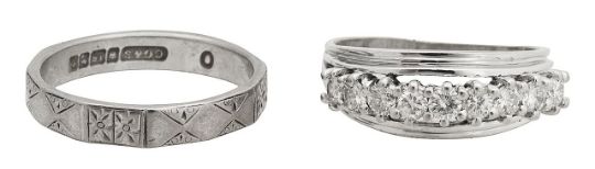 with 18ct hallmark, nine round brilliant cut diamonds set proud of a split textured band together with a block patterned wedding band hallmark 1960-61 (2)