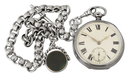 key wind fusee movement, regulation lever annotated slow/fast, unnamed, no.104578, Roman enamel dial with subsidiary seconds, case maker mark PB; together with a Victorian silver faceted link 'Albert' watch chain with hardstone set swivel fob