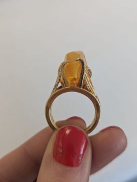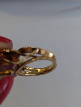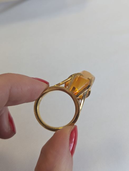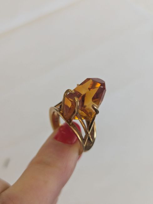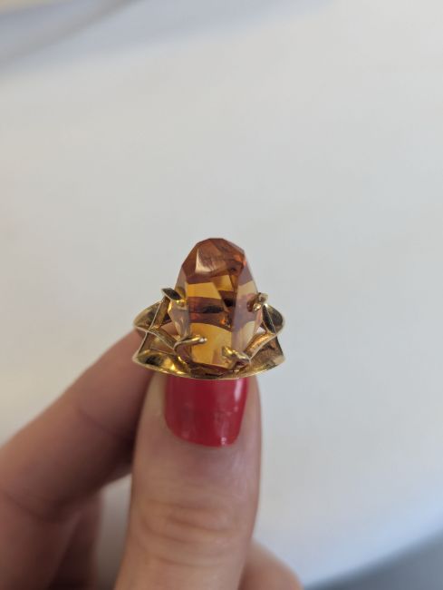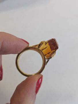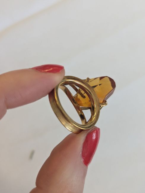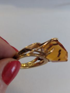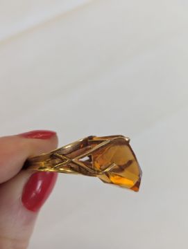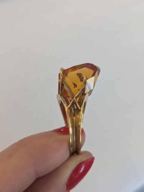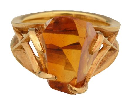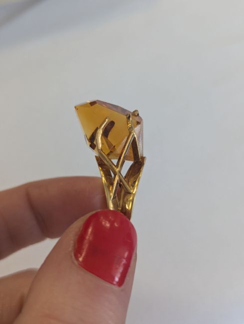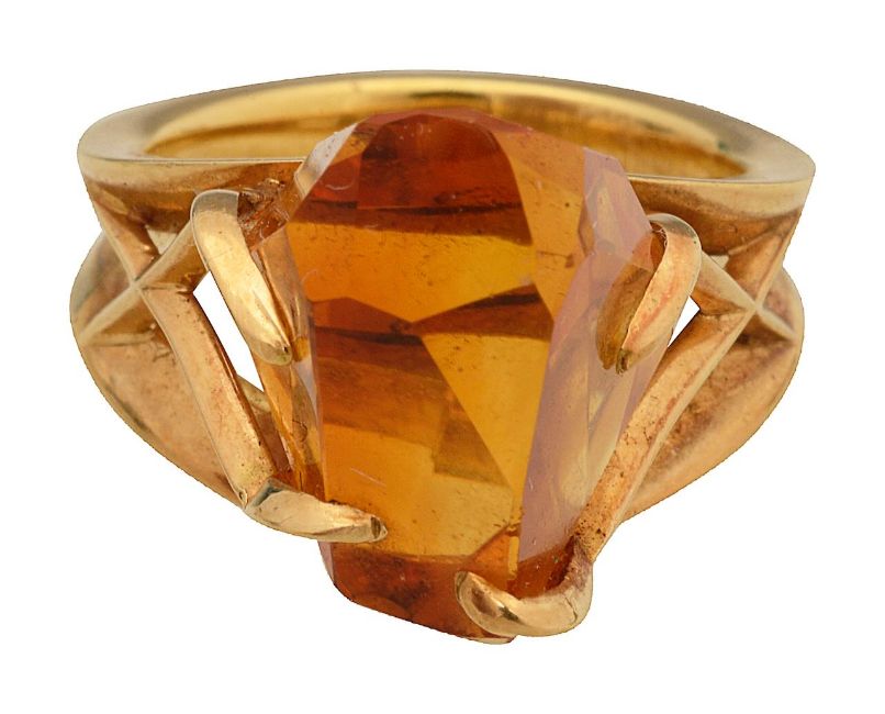 the citrine crystal held by attenuated claws to the openwork shoulders and bifurcated ridged shank, bearing an oval 'Georg Jensen' stamp and engraved '750', turquoise cardboard case for Georg Jensen