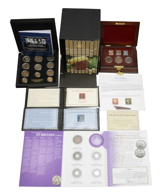 An extensive collection of assorted commemorative coins comprising:HM Queen Elizabeth II 90 Majestic Years Coin CollectionThis collection features original British coins from each year of Queen Elizabeth II's first 90-years, spanning from 1926 to 2016. It includes every denomination issued during her reign (up to her 90th birthday), there are 42 pre decimal coins - such as farthings, Britannia pennies, and crowns - and 49 decimal-era coins, including commemorative issues, fifty pence, and pound coins,The World's First Postage Stamps with Victorian Coinsan historic stamp and coin collection, includes a genuine Penny Black, Two Penny Blue and Penny Red. With these are three pennies minted in the Victorian era that feature the different portraits of the Queen: the large copper 'Young Head', the bronze 'Bun Head', and the bronze 'Veiled Head', also accompanied by two black booklets with information on the 'The Penny Black' and 'The World's Second Postage Stamp'. Stamps and coins they are all in capsules and in box with key and certification; Danbury Mint, United Kingdom. The House of Windsor Coinage Portraits Penny Set An eleven coin set comprised of each royal portrait that has appeared on the penny coins of the five monarchs of House of Windsor, including three 'decimal' pennies of Elizabeth II. All coins are in capsules and box with certificate of authenticity; The Bradford Exchange. HRH, The Duke of Edinburgh Pattern Coin, 1972reverse; 'Model' - the rest is plain, obverse; portrait of Prince Philip from an original plaster by Humphrey Paget, denomination; 25 new pence. In capsule and box with certification; The Bradford Exchange. multiple and variousCondition: Coins are in capsules and uncirculated.Private Collection.