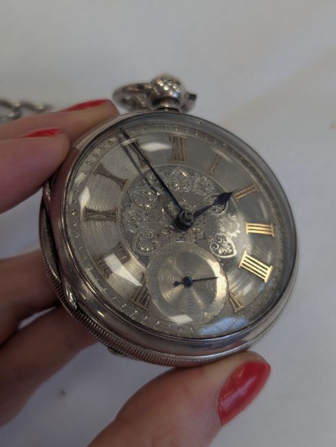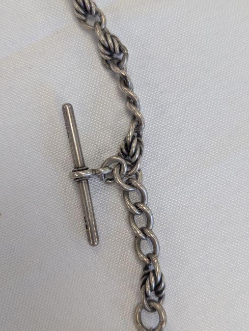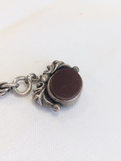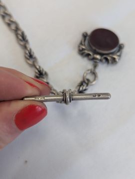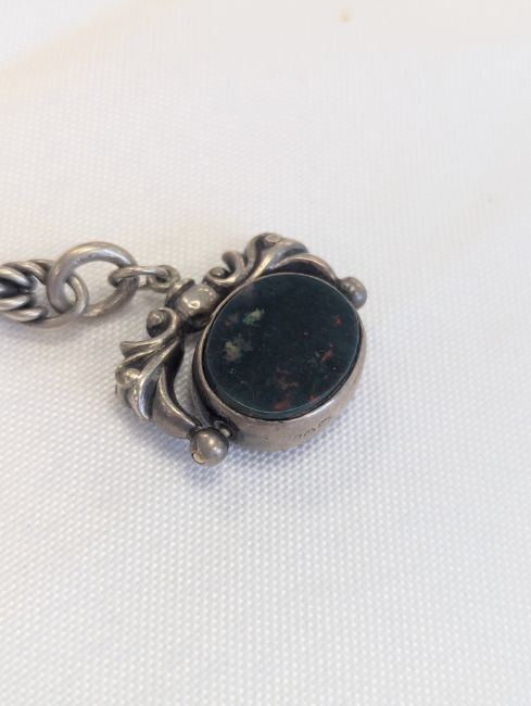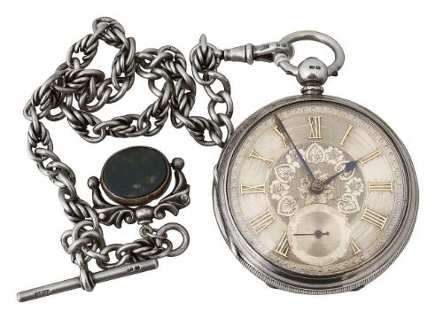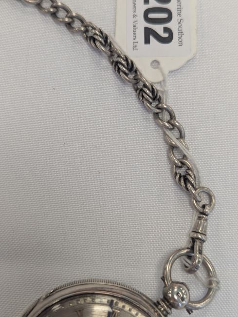key wind fusse movement, regulation lever annotated slow/fast, signed Alex Bennett Rutherglen 37548, silver and gilt Roman dial with tooled decoration, subsidiary seconds, case maker mark for John Fleckner; together with a Victorian silver 'Albert' watch chain with hardstone set swivel fob