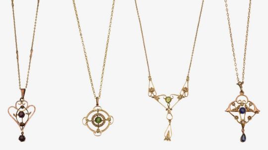 four pendants, featuring 9ct stamp, heart shape wire work, centrally set purple stone and articulated drop fancy chain and barrel clasp, a green stone and seed pearl target pendant with 9ct hallmark new chain, a green stone and seed pearl drop pendant attached to a trace chain and bolt ring clasp with stamp 10k and a 9ct stamp, open work floral motif pendant brooch with centrally set blue stone and articulated blue stone drop (4)