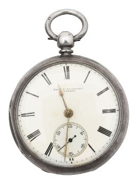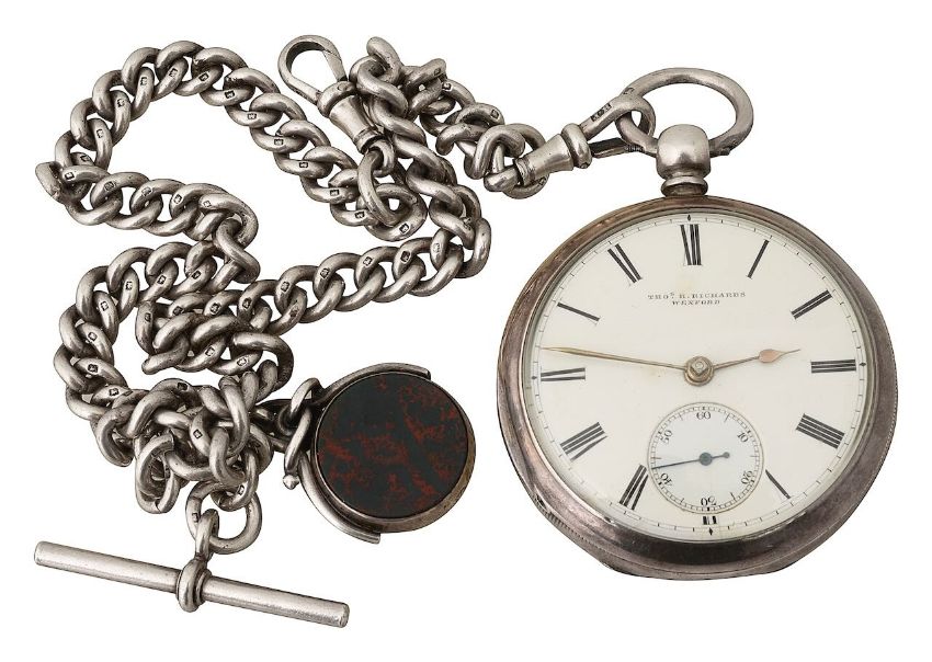 key wind, regulation lever annotated F/S, signed Tho.s H Richards Wexford, signed Roman white enamel dial, subsidiary seconds, case maker mark for Samuel Yeomans; together with Victorian silver curblink 'Albert' watch chain and hardstone set swivel fob