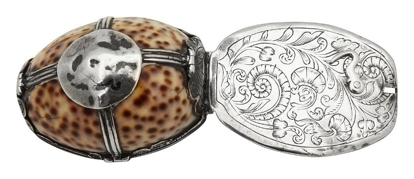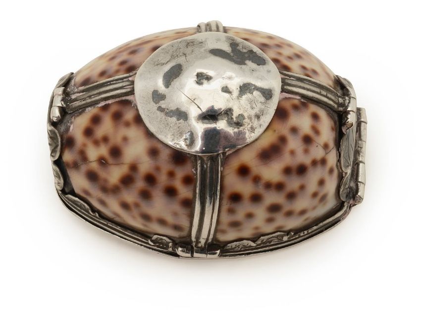 A silver mounted cowrie shell snuffbox,