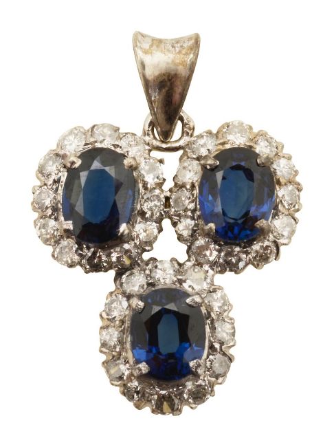 featuring three sets of blue sapphire ovals each with a diamond cluster halo and articulated suspension loop