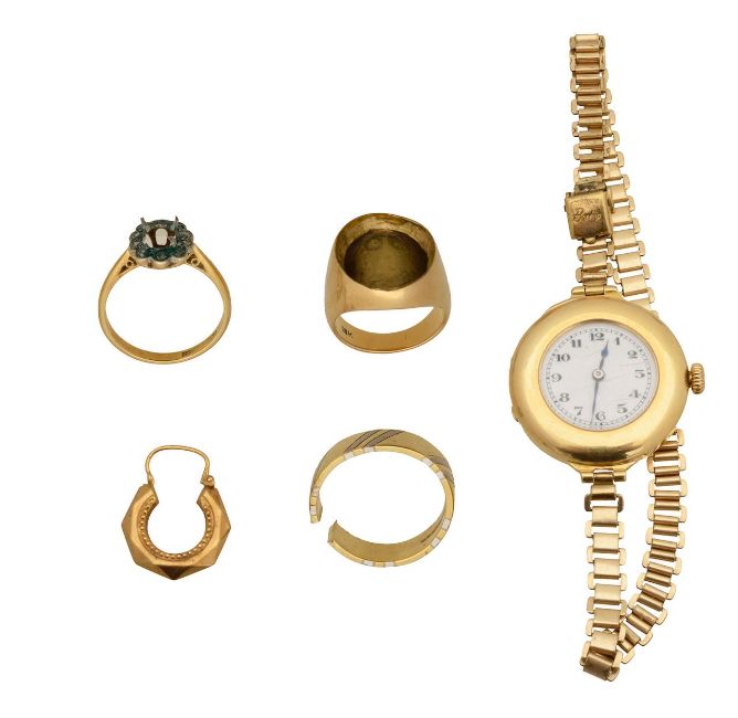 Condition: Watch bracelet rolled gold, wedding band cut apart, signet ring missing a stone, cluster ring missing centre stone and only one ear ring