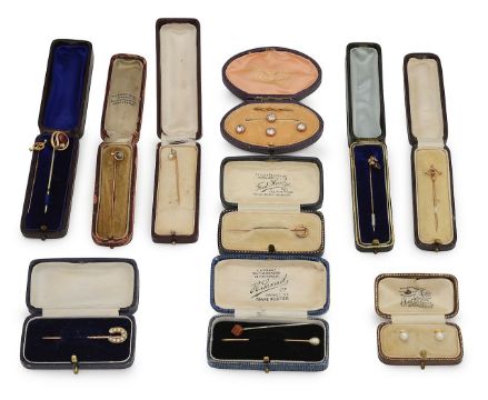 comprising an 18ct horseshoe and white metal topped pin, a 9ct amethyst and seed pearl pin and another similar, a 15ct gold, sapphire and seed pearl topped pin, a cultured pearl and diameter topped pin, a set of gold mounted crystal dress studs etc, many cased (qty)