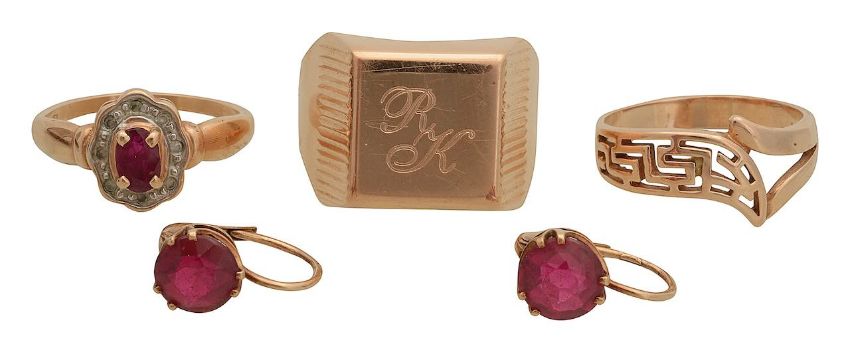with 585 stamped, rose colour metal with a pink oval mixed cut synthetic ruby in a four claw setting and eight white single cut stones together with a pair of pink decorative gem set ear drops (2)