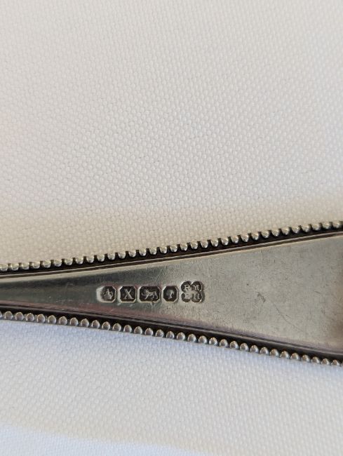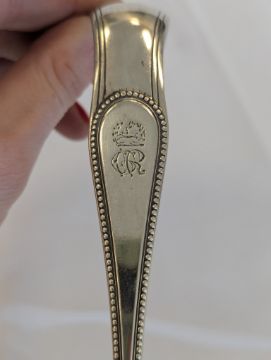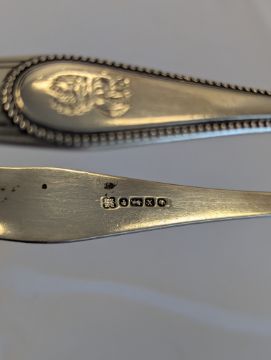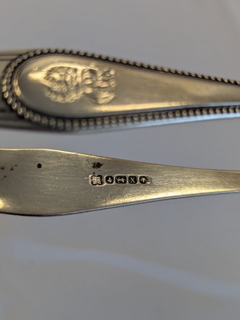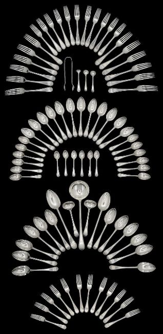 by Martin, Hall & Co, London 1875, comprising twelve tablespoons, twenty-four table forks, eleven dessert forks, twelve dessert spoons, twelve teaspoons, six coffee spoons, three salt spoons, one large ladle, two smaller ladles, two serving spoons, and a pair of sugar tongs, all with beaded borders, and engraved crowned cyphers (qty.)
