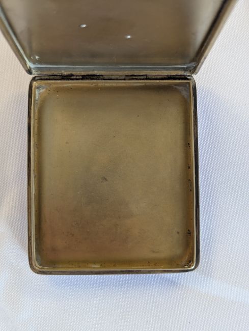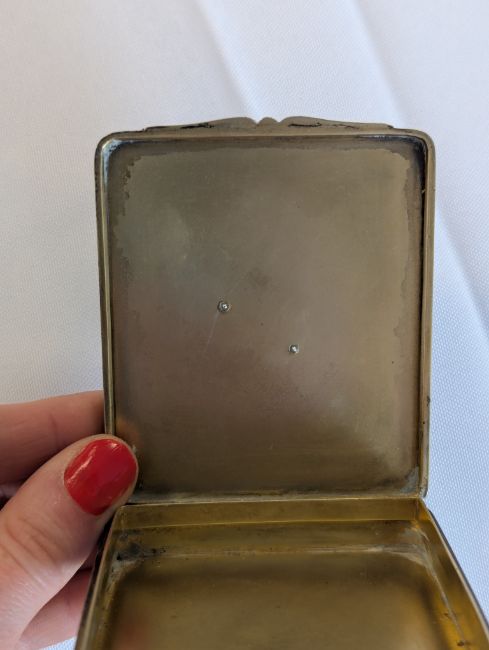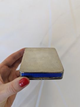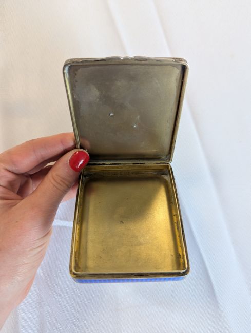 Condition: No chips to the enamel. Some of the marcasite stones are missing. Very minor dent to the top edge.