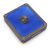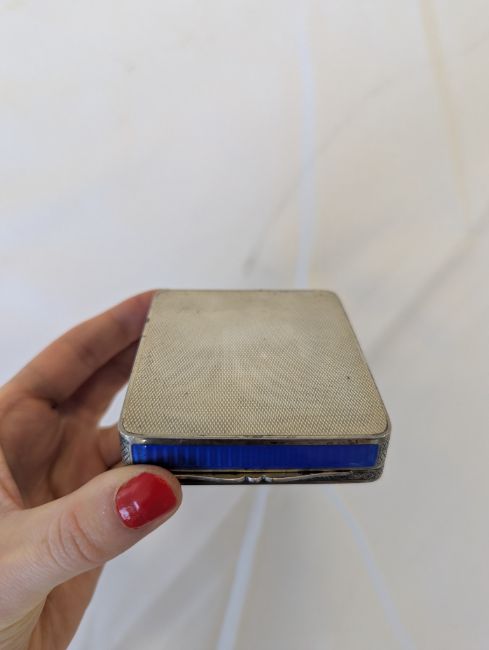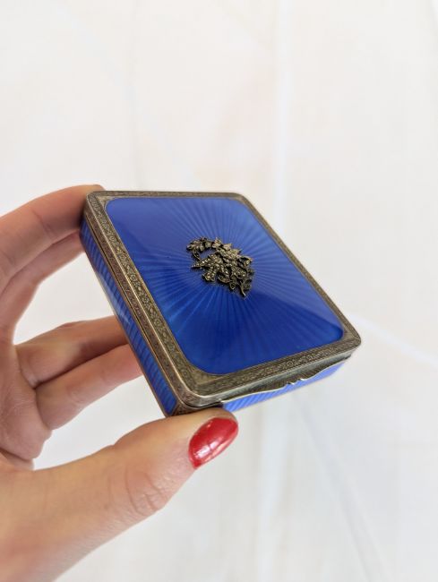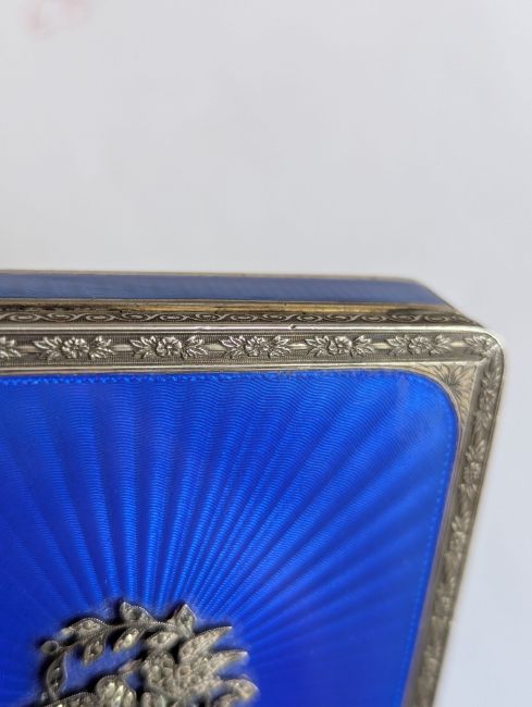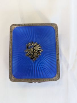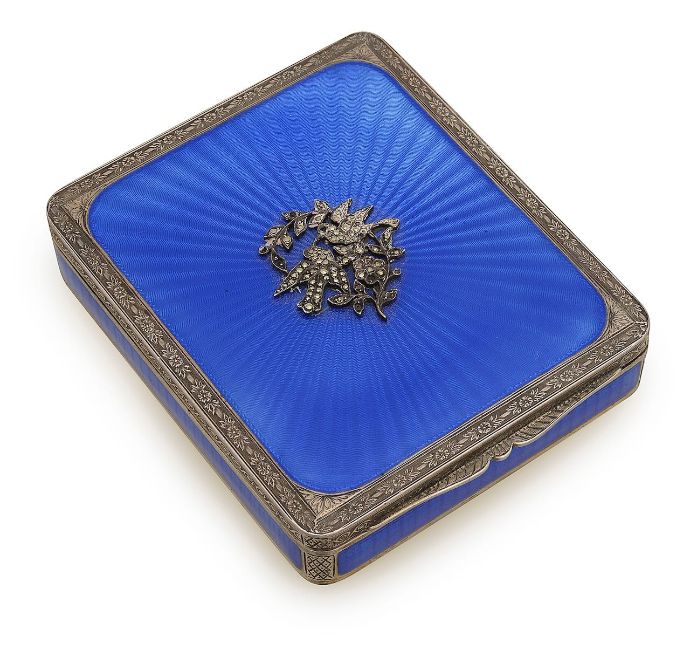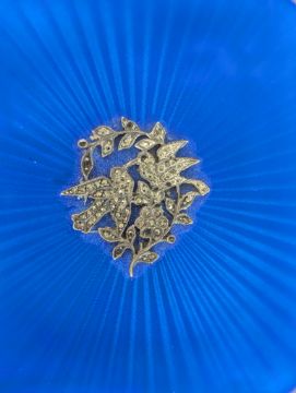 935 standard, the hinged lid inset with marcasite birds perched on a flowering branch, to a radiating blue enamel ground, and engraved floral border, opening to reveal a gilt interior