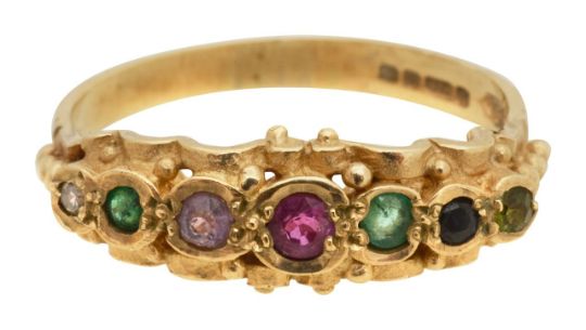 A 9ct gem set acrostic 'Dearest' ring