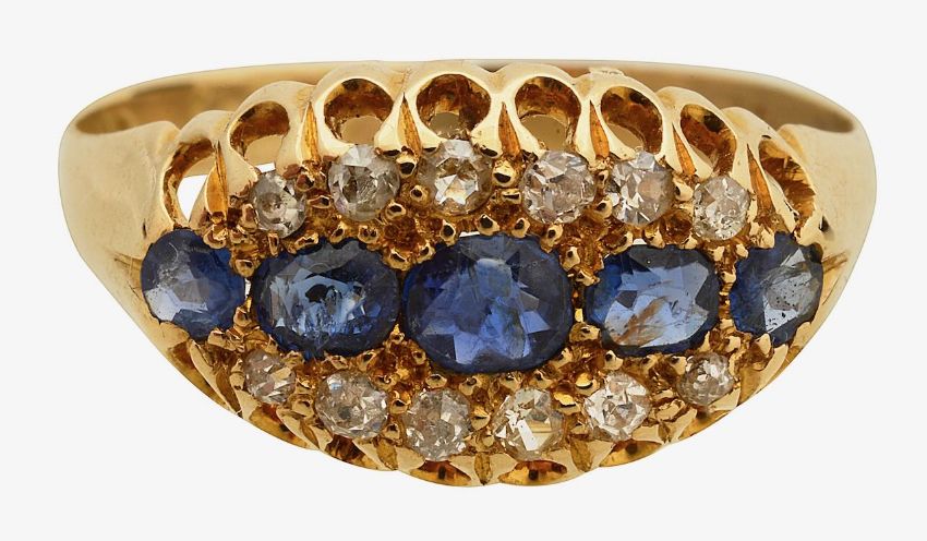 Condition: Visible signs of a re size, diamonds are included but bright, sapphires are mid blue with wear to facet edges