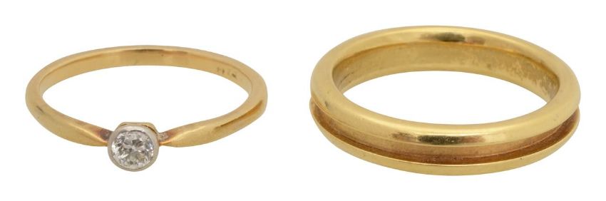 Condition: Channel set band good condition, hallmark worn but readable, condition fair for the single stone ring, tested as gold, diamond size 3.2mm clean and bright