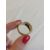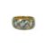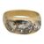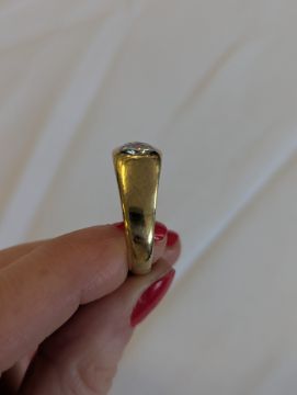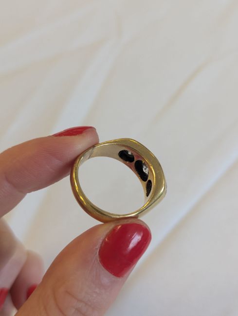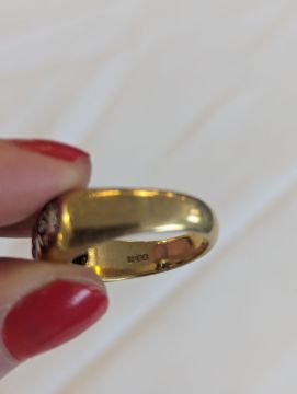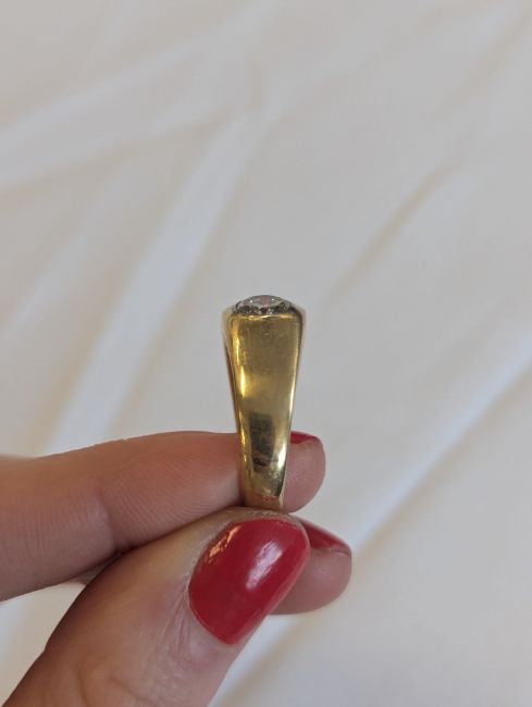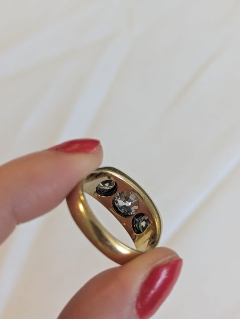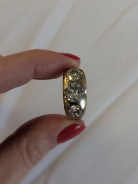 with 18ct stamp, centrally set with an old cut diamond, old style brilliant cuts either side, mounted in white metal invisible setting to a yellow heavy tapering band