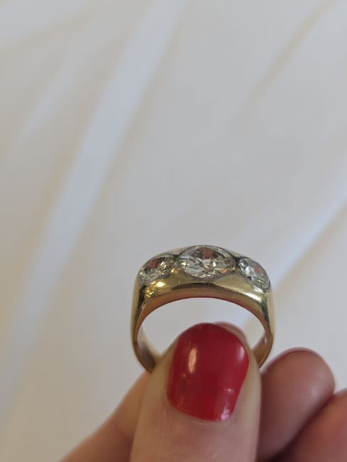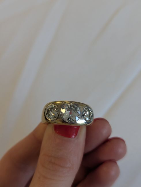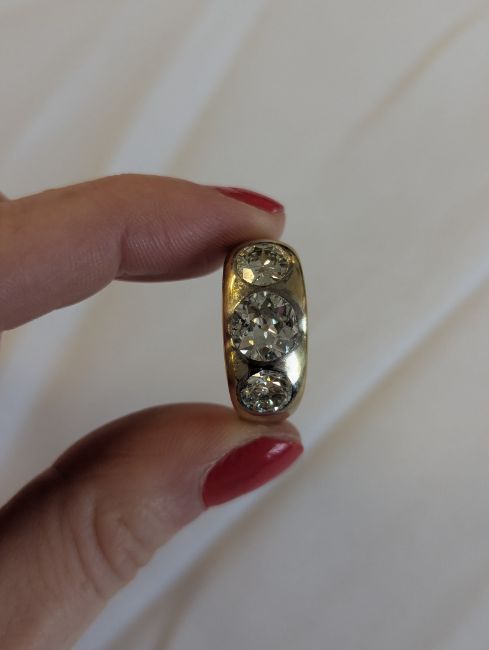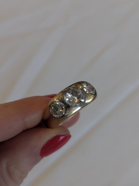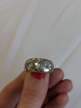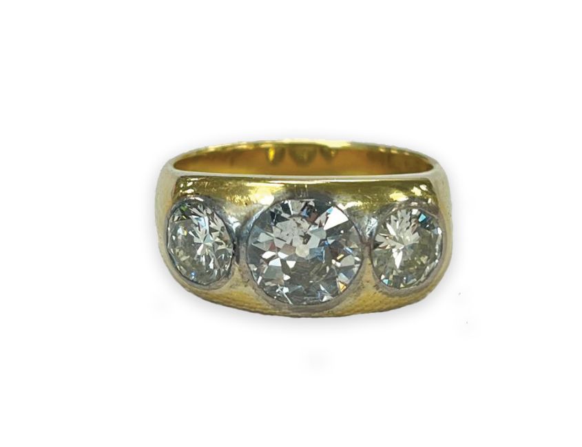Condition: Total approx. diamond weight 1.6ct centre, each shoulder stones 0.7-0.8ct, centre stone has a big culet all stones measured mm in a bezel setting, tested as high carat gold, shoulder stones good SI, centre stone has more inclusions with surface reaching naturals SI2, colour difficult to determine due to setting faced up white to K