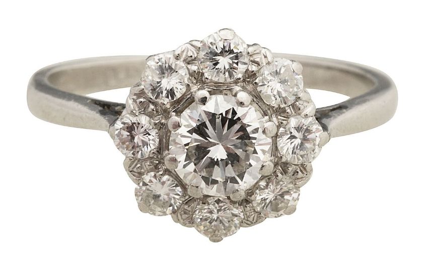 with PLAT stamp to inside, centrally claw set with a brilliant cut solitaire surrounded by eight diamonds in a rex collet mounted to a tiffany style band