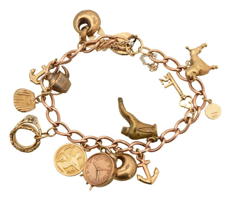 A charm bracelet with fourteen charmswith 9ct 375 stamp, curb bracelet with heart lock, charms including clock, Saint Christopher, poodle, rings, bag, anchor, key 21, Sagittarius plus six more, weight 30gCondition: Fair-poor condition, large boot charm not gold, safety catch missing/ broken, two charms dented