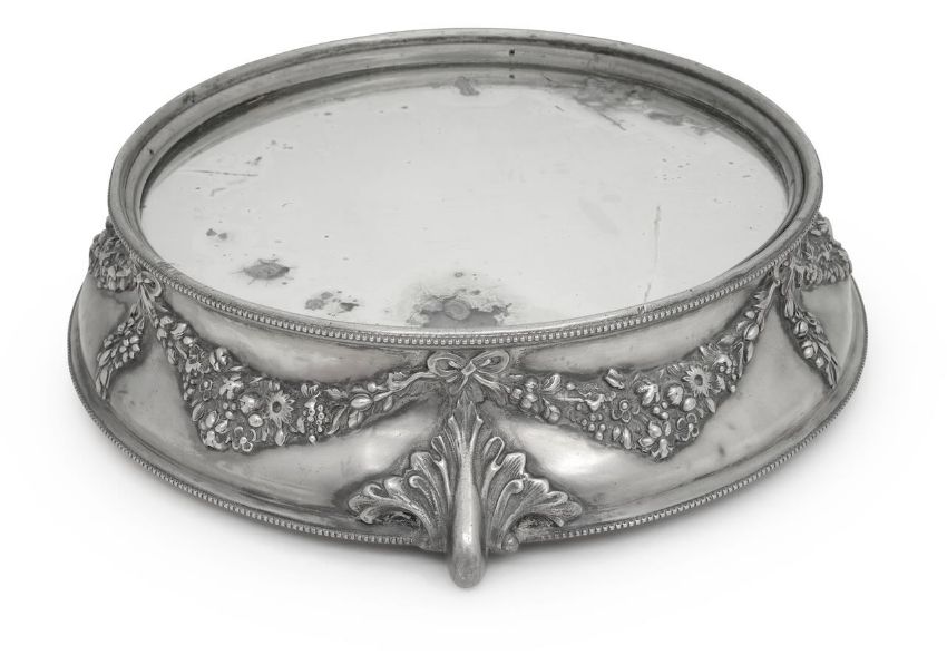 early 20th century, with a circular mirrored glass top, to a silver plated base decorated with floral garlands and a beaded rim, on a wood base