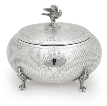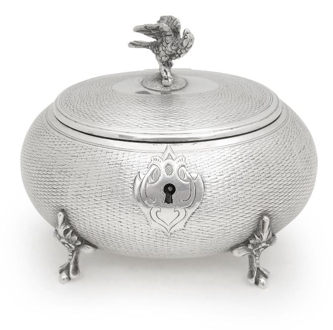 800 standard, late 19th/ early 20th century, of oval form, the hinged lid with an eagle finial, opening to reveal a gilt interior, to engine-turned decoration, raised on four stylised floral and hoof feet, with key