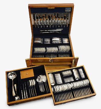 with a silver plaque, inscribed '2000 Silverware', for twelve settings, comprising table knives and forks, dessert knives, forks and spoons, soup spoons, fish slices, teaspoons, coffee spoons, cake forks, four serving spoons, two ladles, a cake slice, two serving knives, six berry bowl spoons, and a three piece carving set
