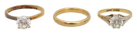 with 9ct hallmark to wedding band, soft D shape profile, a round old cut white zircon gem stone in an eight claw rex setting with 18k and plat stamp to band and a white gem stone held in a four claw setting with a yellow band (3)