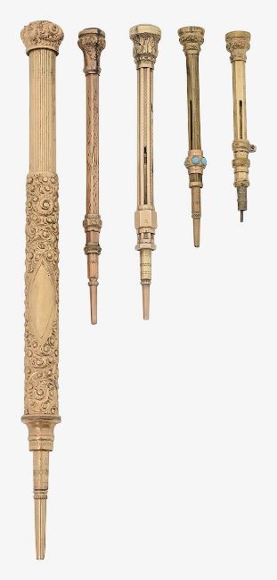 the miniature examples modelled as Corinthian columns, with hardstone finials, and another rolled gold example, by W.S Hicks, New York (5)
