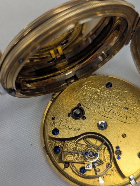 London, 1926, white enamel dial with sunk subsidiary seconds, 3/4 plate fusee movement with ratchet tooth lever escapement, plain gold three arm balance, signed and numbered Cook & Burchett, 72, 73 & 130 Oxford Street, London, No.10548, engine-turned case with hallmarks for London 1926 and numbered as the movement, with initials and monogram