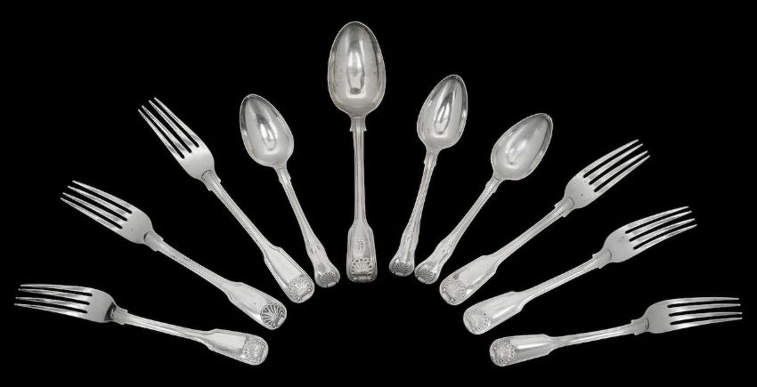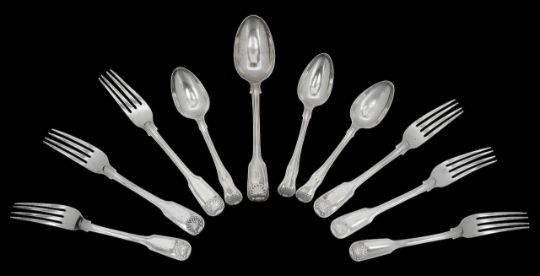 comprising a set of six Fiddle, Thread and Shell pattern forks, by Robert Pringle, London 1824, with engraved angel wing crest, a similar tablespoon, by William Eaton, London 1837, with an engraved letter 'K', and a set of three King's Husk pattern dessert spoons, by William Eley I & William Fearn, London 1805 (10)