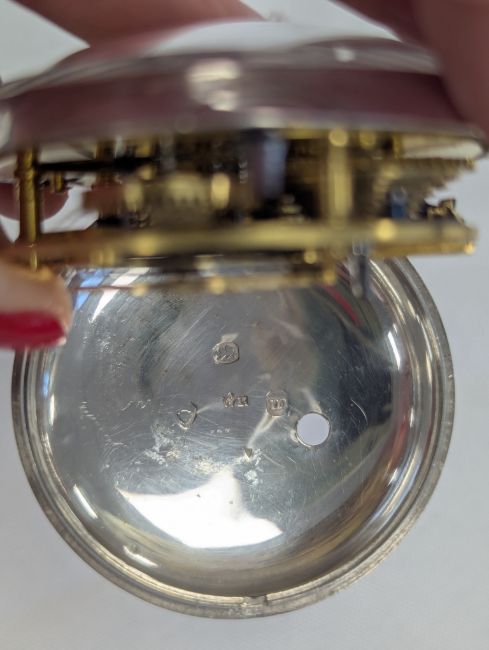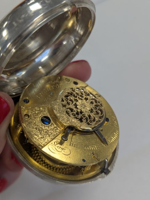 key wind fusee movement with verge escapement, regulation lever annotated slow/fast, signed Josh Wilmshurst Brighton 742, Roman white enamel dial, case maker mark for William Rowlands