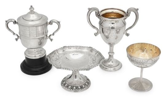 comprising a twin-handled example, Birmingham 1931, inscribed 'D.L.S.C. Neatest Diving Juniors Won By E. Clapham 1932, Presented by Sir Dhunjibhoy and Lady Bomanji', a smaller lidded example, by William Hutton & Sons, Birmingham 1912, inscribed 'Presented to Trooper F.G Phipps by Lieut Col. The Earl of Guilford', a goblet inscribed to 'Sir Harold Clowes O.B.E, J.P', and a 'Pigeon Match' pedestal dish, by Harrison Brothers, Sheffield 1907, 'presented by Viscountess Stormont' (4)